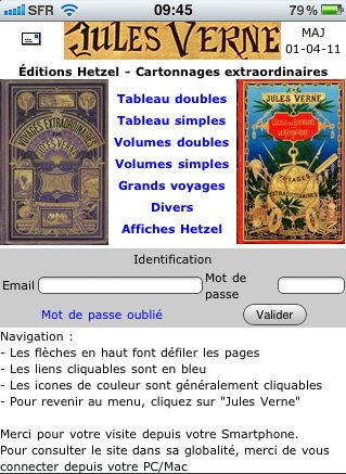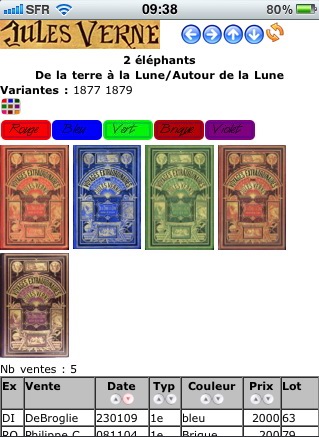| Page d'accueil, sur un Iphone | Page consacrée à un cartonnage, pour un titre, dans la version complète (incluant les résultats de ventes) |