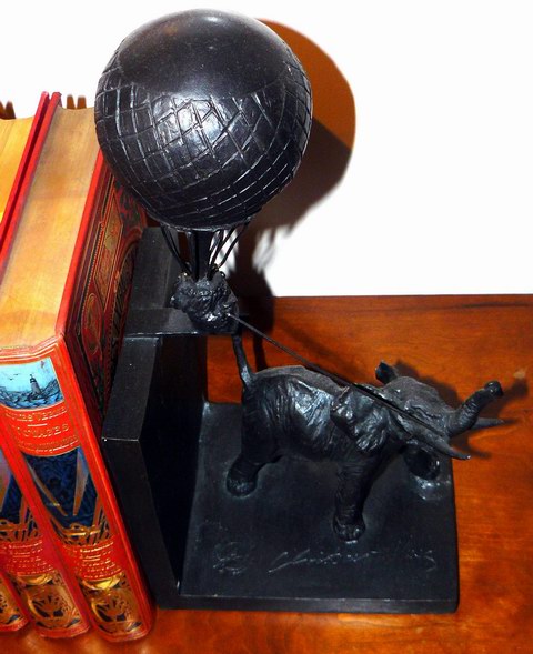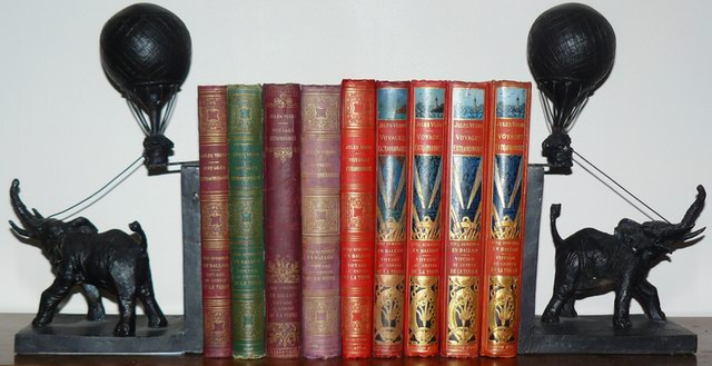 Quoi de mieux que de placer, entre ces 2 serre-livres, la quasi totalité des cartonnages en volume double pour '5 semaines en ballon/Voyage au centre de la terre'.